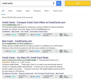 A keyword like “credit cards” is highly competitive, with the first page dominated by established, popular websites with thousands of inbound links. Below, we’ve analyzed the top three results for “credit cards” using the MozBar Chrome extension: