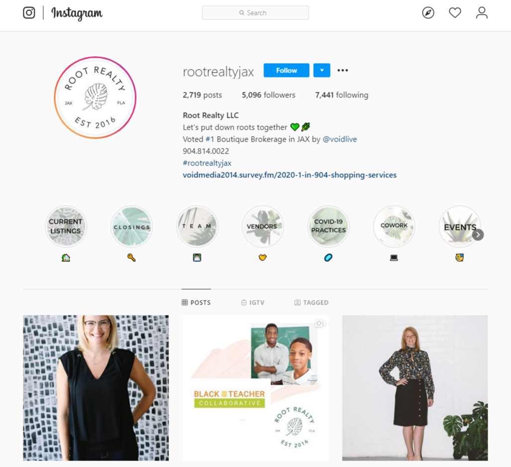 Looking for inspiration from a smaller company? Root Realty is a Florida real estate company that posts photos of their real estate agents, new listings and design inspiration. They also show followers what goes on behind the scenes! A cool feature they have created is “feedback Friday” where they post testimonials from clients each Friday. This shows their leads and followers that they are professionals and they’re also really good at what they do! Getting good reviews online is immensely important because the majority of the time, potential clients will seek out reviews before they decide to work with you.