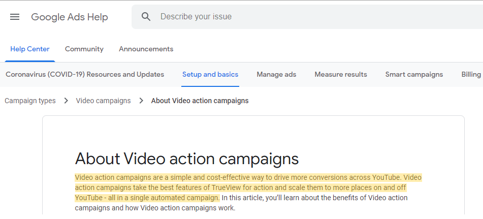 A note on Video Action Campaigns, according to Google: